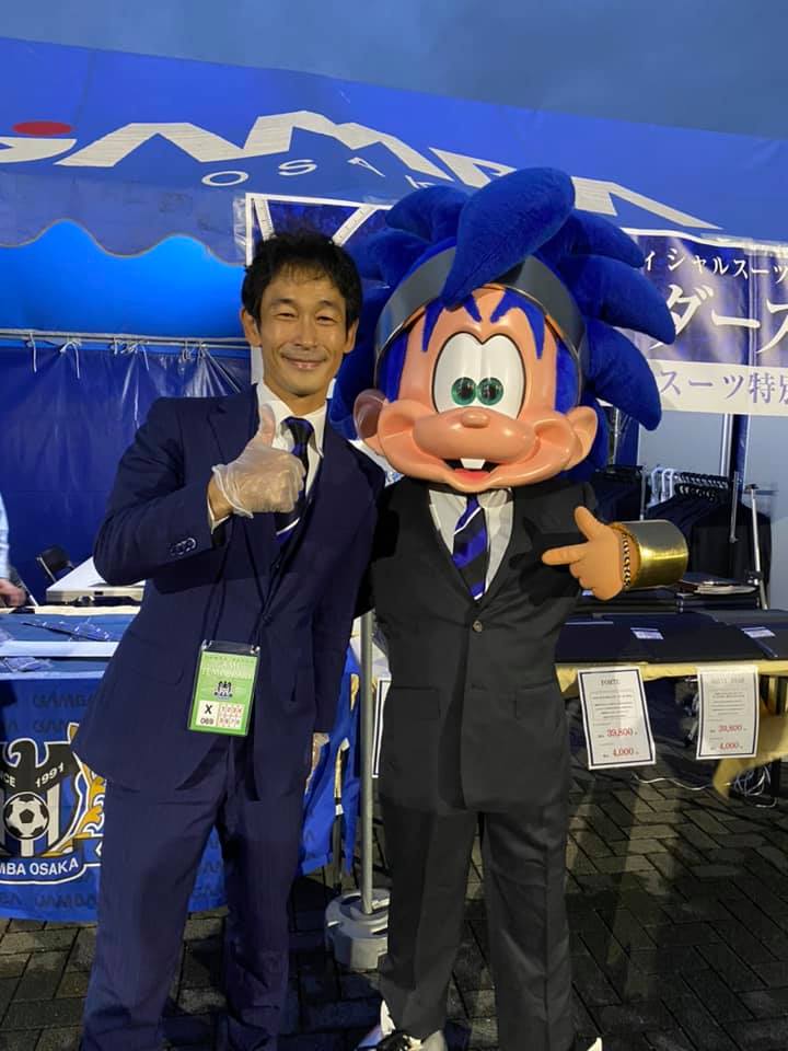 更には、スタジアム前の広場に設置させて頂いたSADA特設ブースに、チームマスコットのガンバボーイが、ガンバ大阪公式オーダースーツ姿で駆け付けてくれました!そして、Panasonicスタジアム吹田では初のキックインセレモニーもやらせて頂きました(^^)