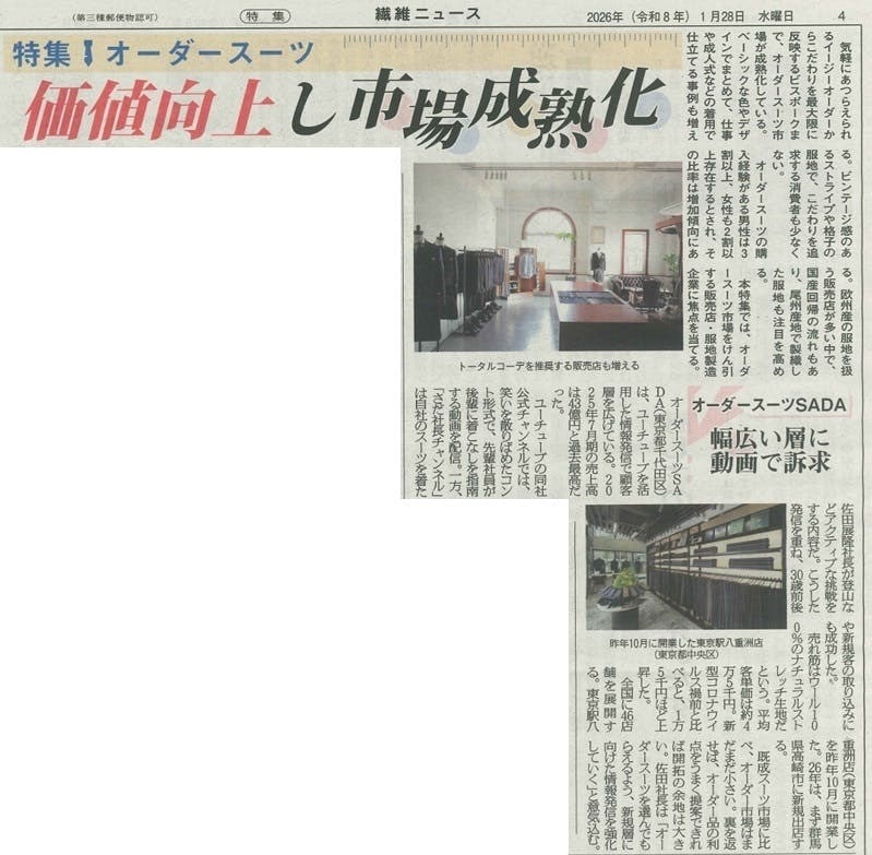 2026年1月28日「繊維ニュース」に掲載されました! 新聞 オーダースーツSADAが取材され記事が掲載されました。※この記事は『繊維ニュース』を発行するダイセンの転載許諾を受けています 「繊維ニュース」は、1950年創刊の日刊繊維・ファッション専門紙です。繊維市場、繊維業界全般のニュースの報道と解説を行っています。