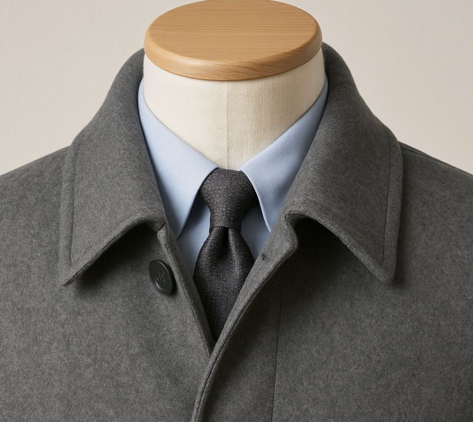 もう一つの特徴が比翼仕立てです。第一ボタンより下の前立てを二重構造にし、ボタンやファスナーを外から見えないようにすることで、装飾を抑えたスマートなデザインに仕上がっています。これにより、上品で洗練された雰囲気を演出できるだけでなく、防寒性を高める効果もあります。