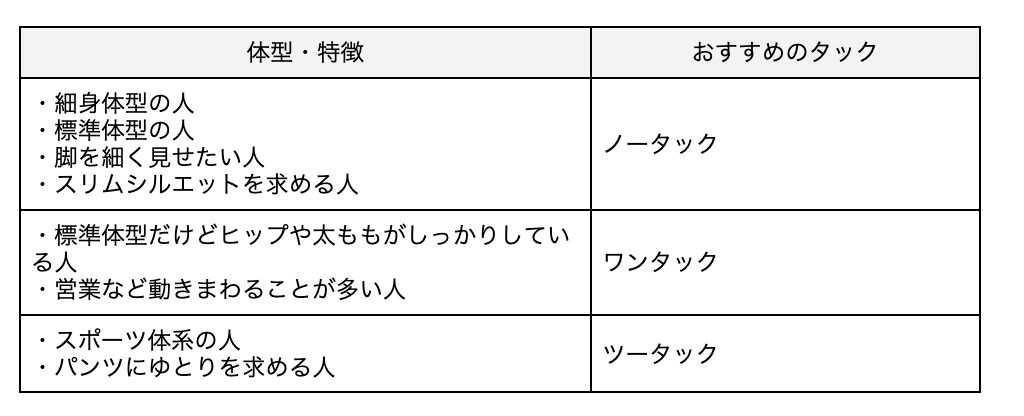 細身体型や脚を細く見せたい方はノータックですっきり、標準体型でヒップや太ももにゆとりが欲しい方や動きの多い方はワンタック、スポーツ体系でゆとりが欲しい方はツータックがそれぞれおすすめです。