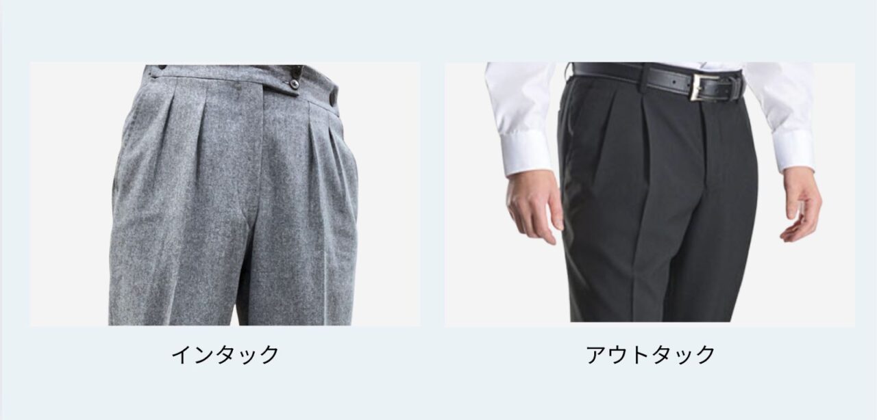 タックには「インタック」と「アウトタック」2種類の向きがあり、その方向によってパンツの印象が大きく変わります。