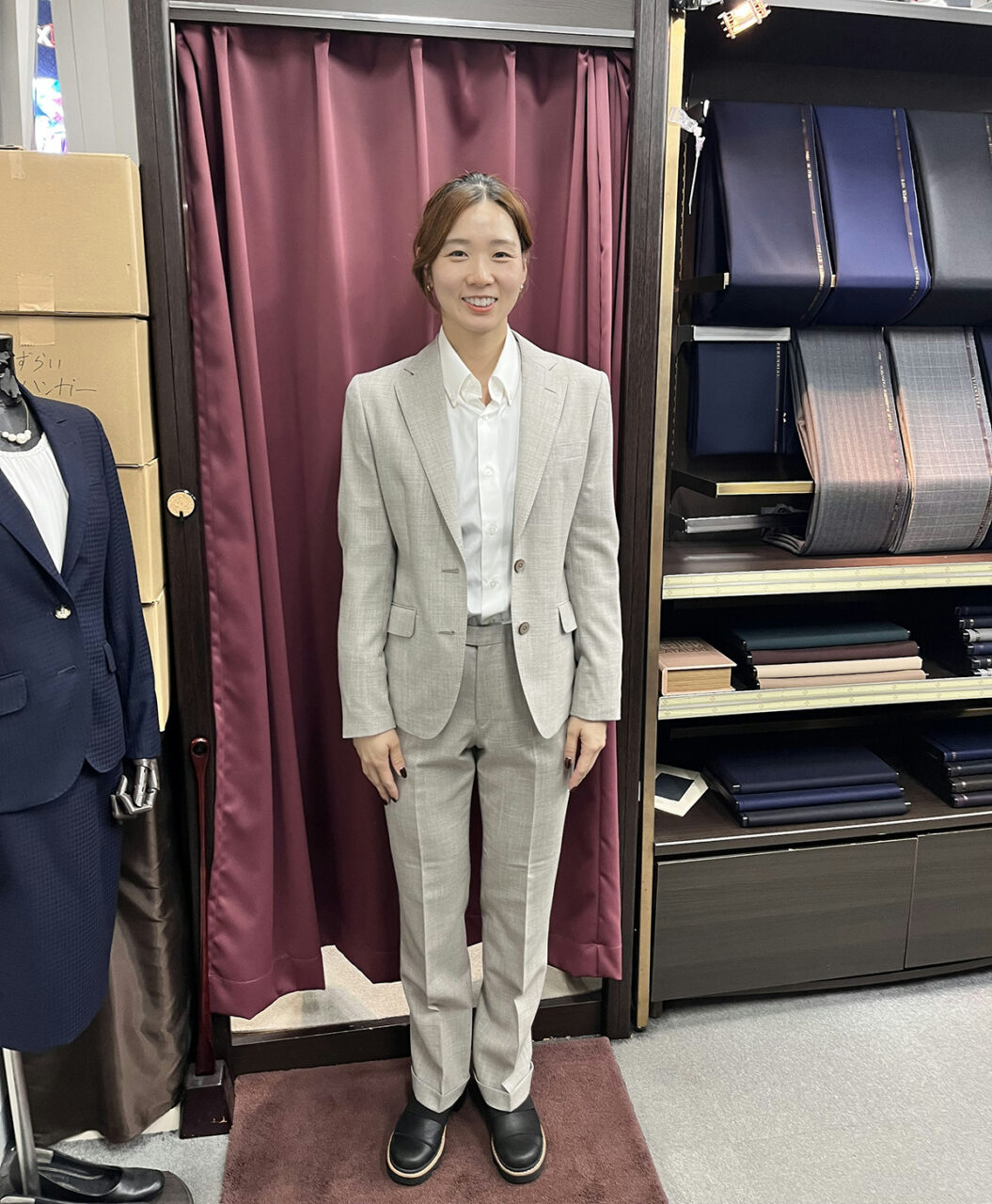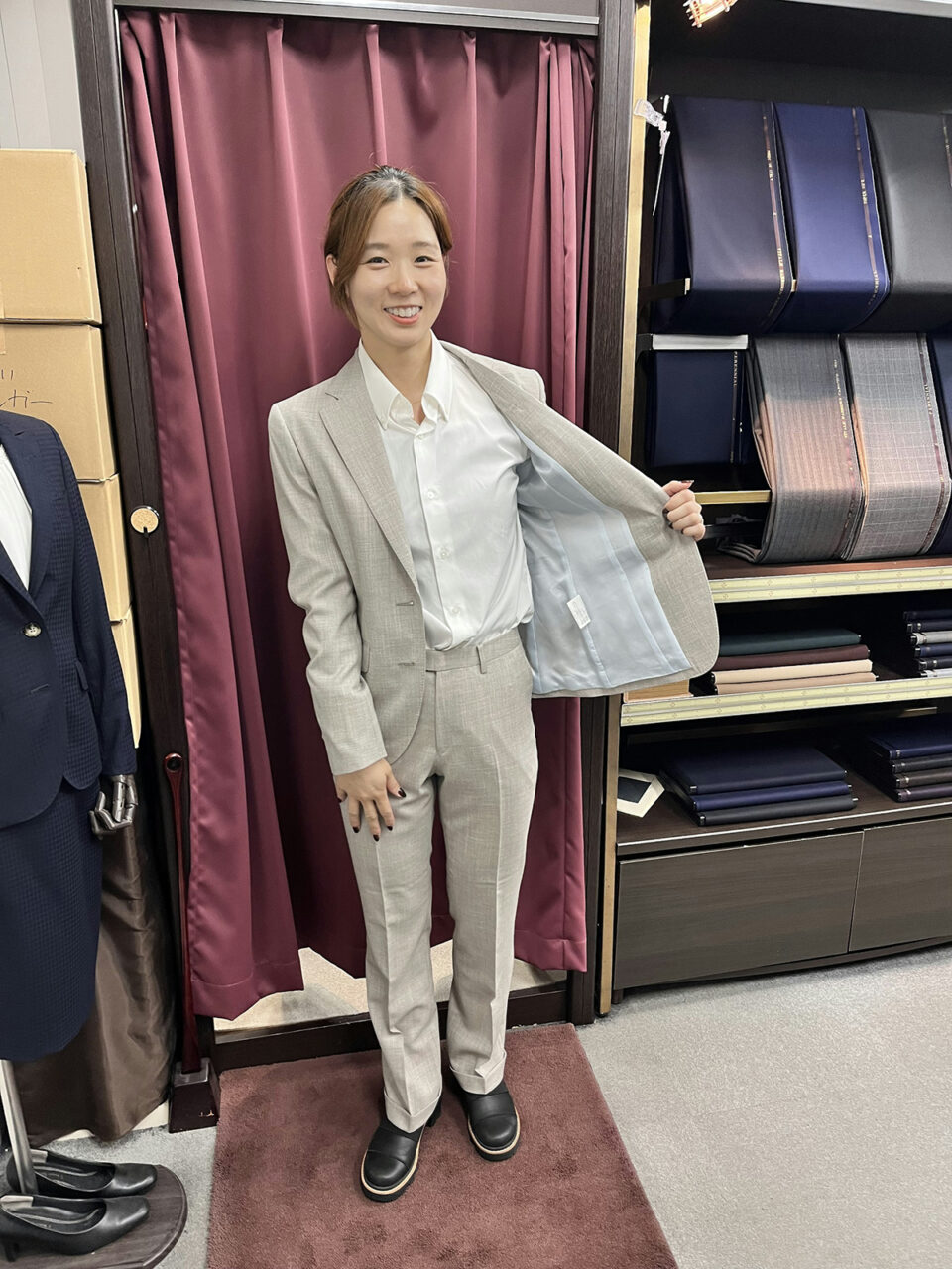 | タイプ | シングル 2つボタン センターベント 斜めフラップ付きポケット 総裏 ノータック 裾口ダブル |