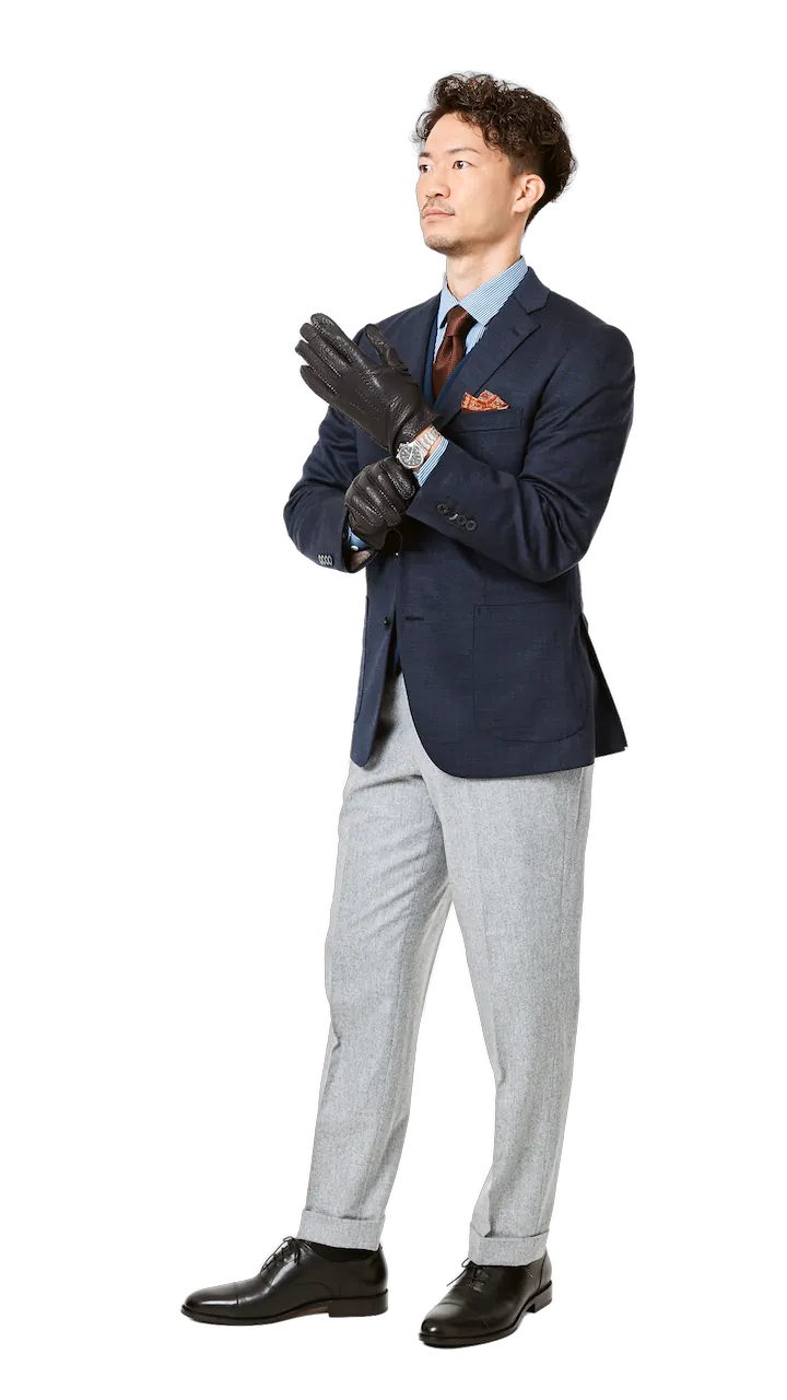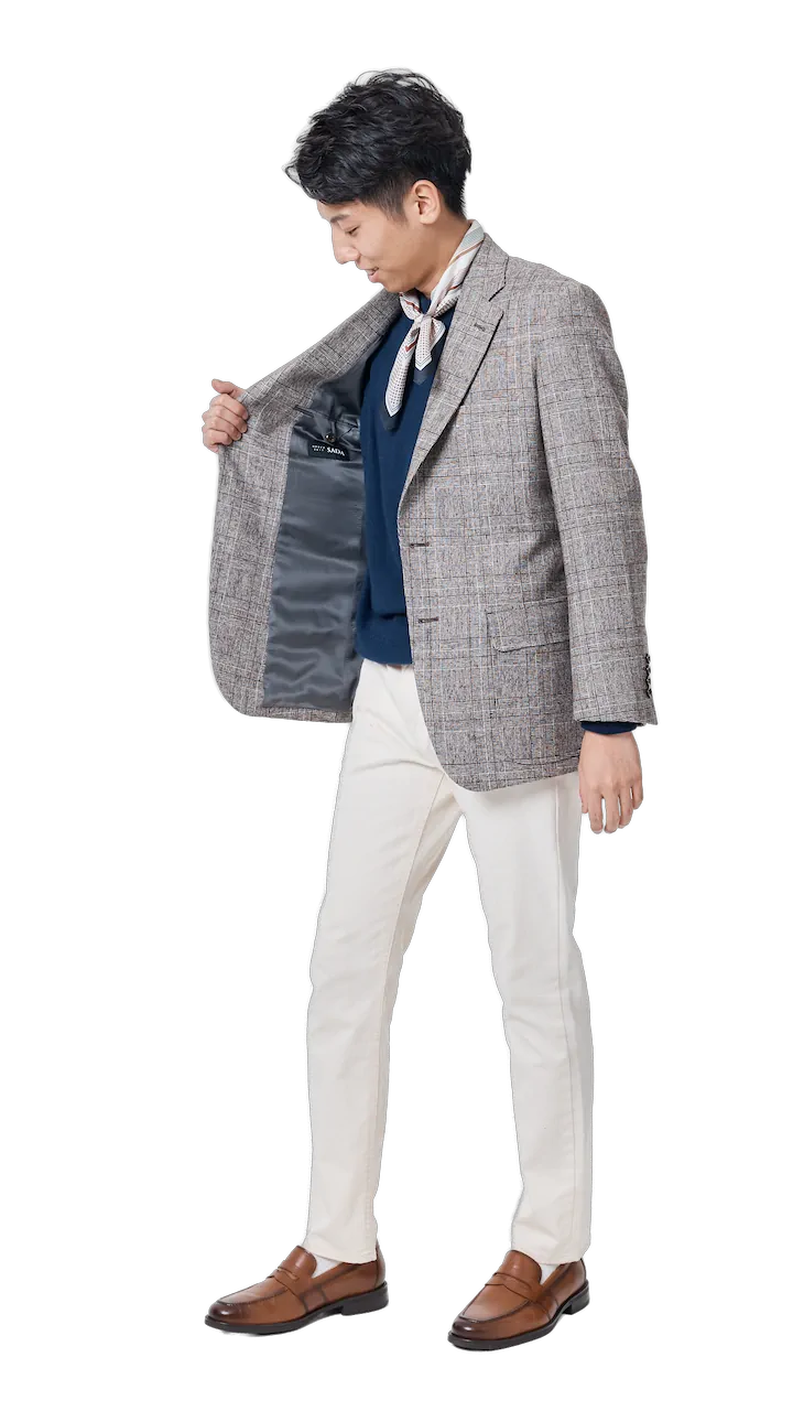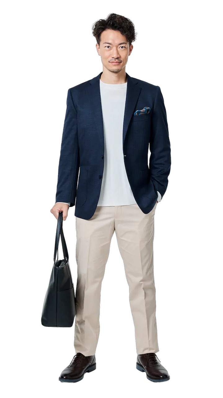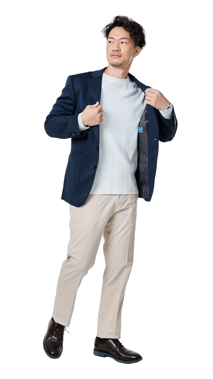 スマートカジュアルに必要なのは、品の良さとリラックス感の両立。肩パッドを省いた「アンコン仕立て」は、ノーネクタイ・クールビズスタイルにも人気。軽い着心地でもジャケットらしい佇まいに。デスクワークや移動が多い日も、快適に過ごせます。