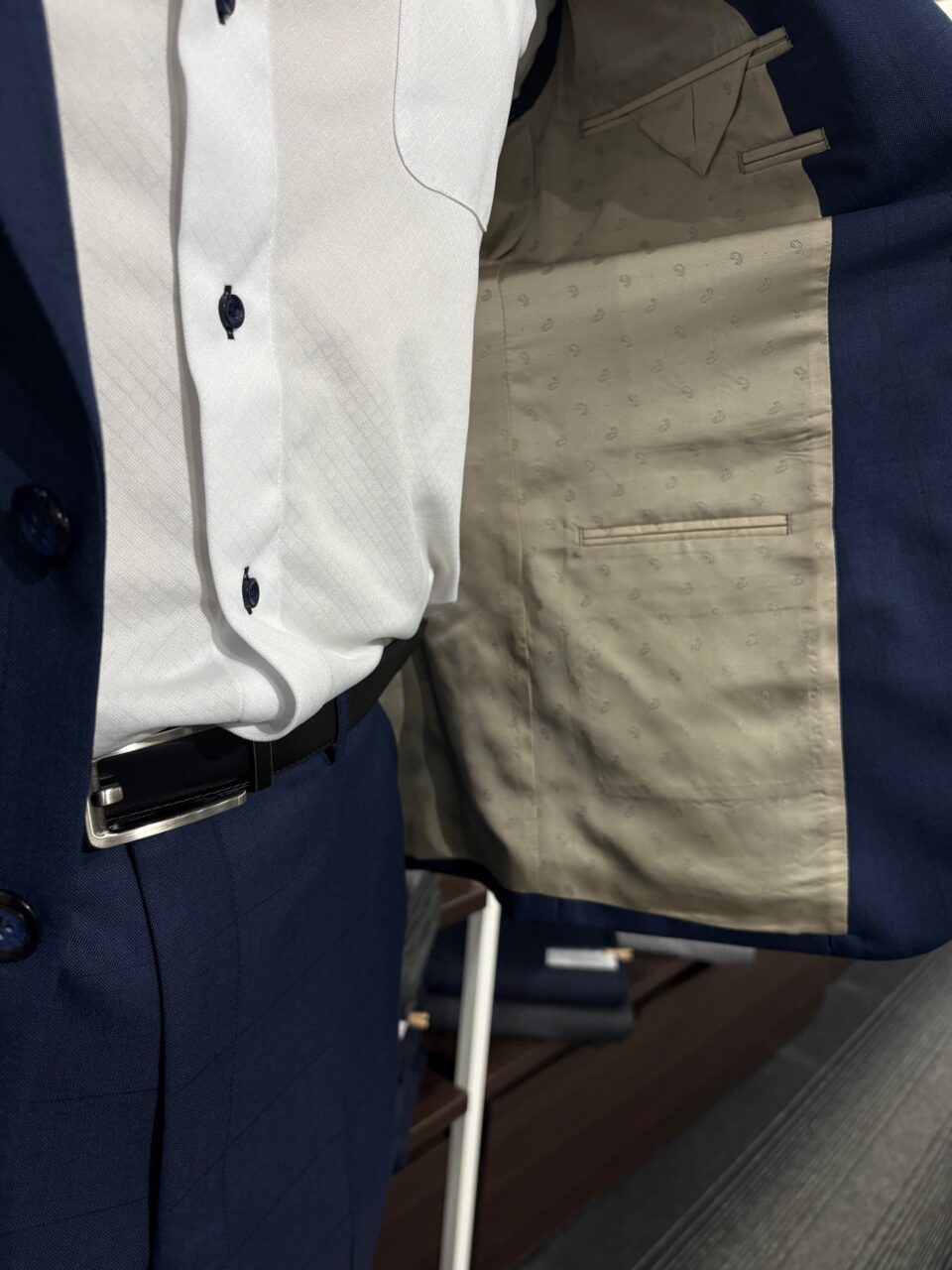 ブルー ウィンドウペン柄 Y.M様/20代/男性 オーダースーツSADA アクタ西宮店 投稿日 2025年11月23日 NEW! 最終更新日 2025年11月23日 2釦シングルブレストスーツ 生地素材 ウール50%/ポリエステル50% ブルー ウィンドウペン 秋冬生地 生地No.7-6512 裏地 キュプラ100% ベージュ 小紋ペイズリー 裏地No.SU-643 ボタン オーバル釦 紺色 釦No.K-58 オプションその他 PP加工 シック加工 Dカン アームシック 担当スタイリスト 田中