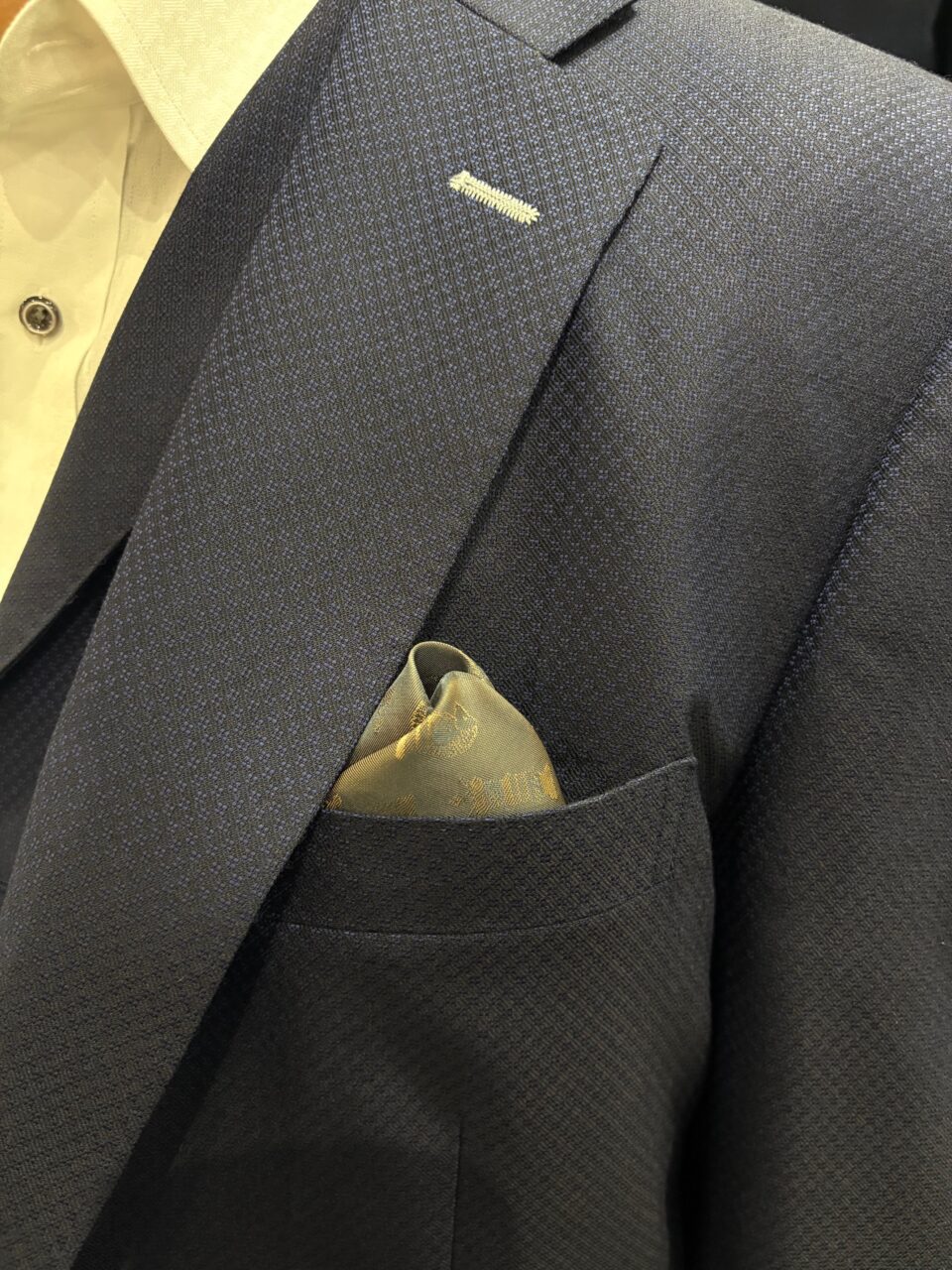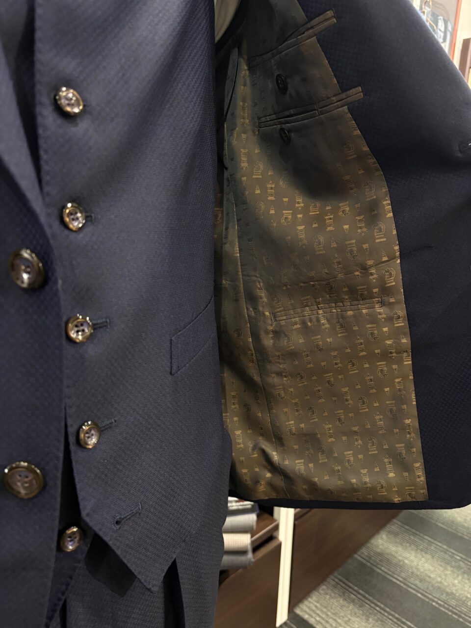 【Super100’s】ネイビー ジオメトリック柄スーツ K.A様/30代/男性 オーダースーツSADA アクタ西宮店 投稿日 2025年12月14日 NEW! 最終更新日 2025年12月14日 2釦シングルスリーピーススーツ 生地素材 ウール100%【Super100's】 ネイビー ジオメトリック柄 秋冬生地 生地No.7-6837 裏地 キュプラ100% グレーゴールド チェス柄 裏地No.SU-670 ボタン オーバル釦 赤紫色 釦No.K-48 オプションその他 胸ポケットチーフ仕立て AMFステッチ チェンジポケット 色糸(衿穴) 本開き PP加工 シック加工 Dカン アームシック 携帯ポケット 担当スタイリスト 山田