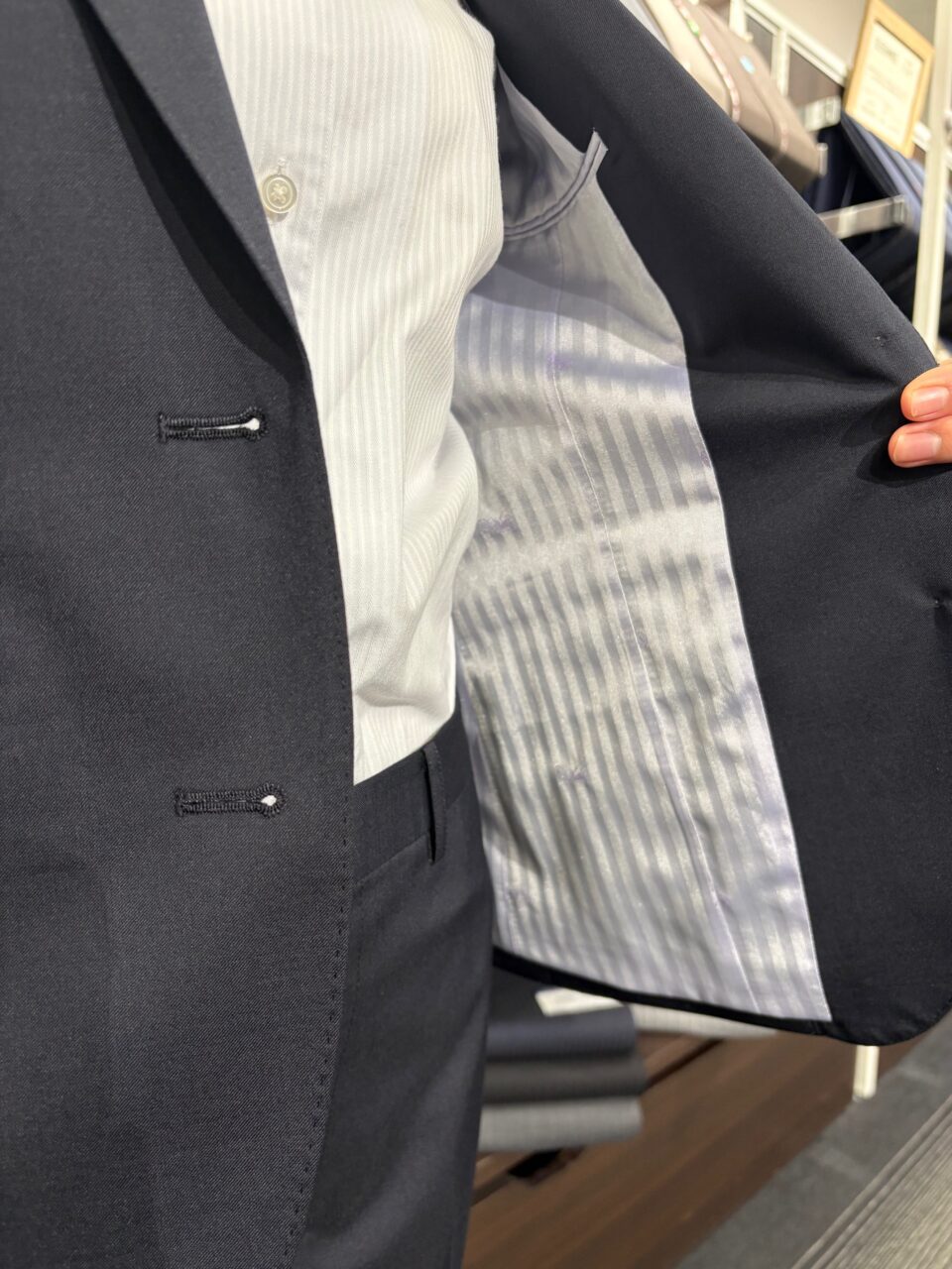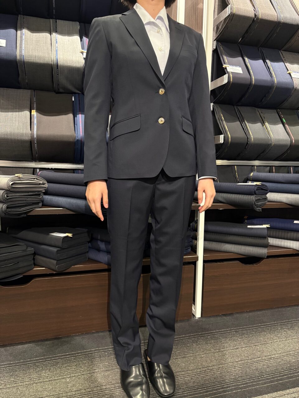 紺無地レディーススーツ M.K様/20代/女性 オーダースーツSADA アクタ西宮店 投稿日 2026年1月27日 NEW! 最終更新日 2026年1月24日 2釦シングルブレストスーツ 生地素材 ウール30%/ポリエステル70% 紺色 無地 秋冬生地 生地No.7-6562 裏地 ポリエステル60%/キュプラ40% ラベンダー色 馬車柄 裏地No.SU-735 ボタン オーバル釦 ベージュ 釦No.F-4 オプションその他 AMFステッチ PP加工 担当スタイリスト 山田