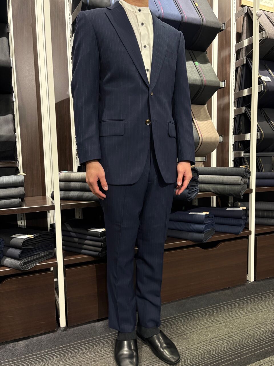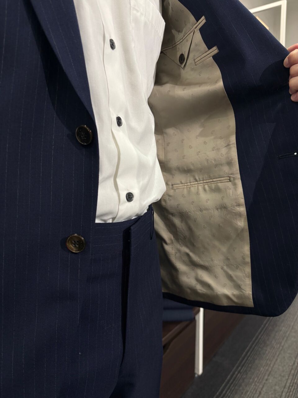 ネイビー オルタネイトストライプスーツ K.B様/男性 オーダースーツSADA アクタ西宮店 投稿日 2026年3月26日 NEW! 最終更新日 2026年3月26日 2釦シングルブレストスーツ 生地素材 ウール70%/ポリエステル30% ネイビー オルタネイトストライプ 秋冬生地 生地No.7-9522 裏地 キュプラ100% ベージュ 小紋ペイズリー柄 裏地No.SU-643 ボタン サンダー釦 ブラウン 釦No.SB-125 オプションその他 PP加工 シック加工 Dカン アームシック スペアスラックス 担当スタイリスト 山田
