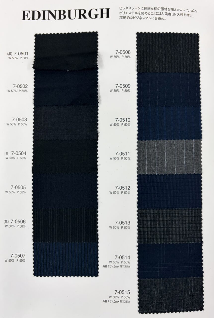 エジンバラはポリエステルを50%混紡した素材となっております。ウール100%に比べ硬さはあるもののポリエステルを混紡する事で耐摩擦性に優れ耐久性の高い生地となっております。
