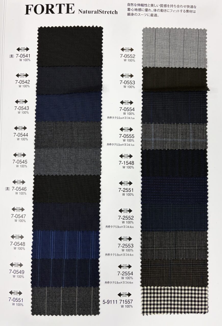 このフォルテは、ウール100%の天然繊維を使用し、ストレッチ性を作り出していますのでデメリットを軽減しています。化繊のもつ不自然な伸び感はございません。通常ウール生地のストレッチ性は3%~4%ですがこのフォルテは8%~9%になります。
