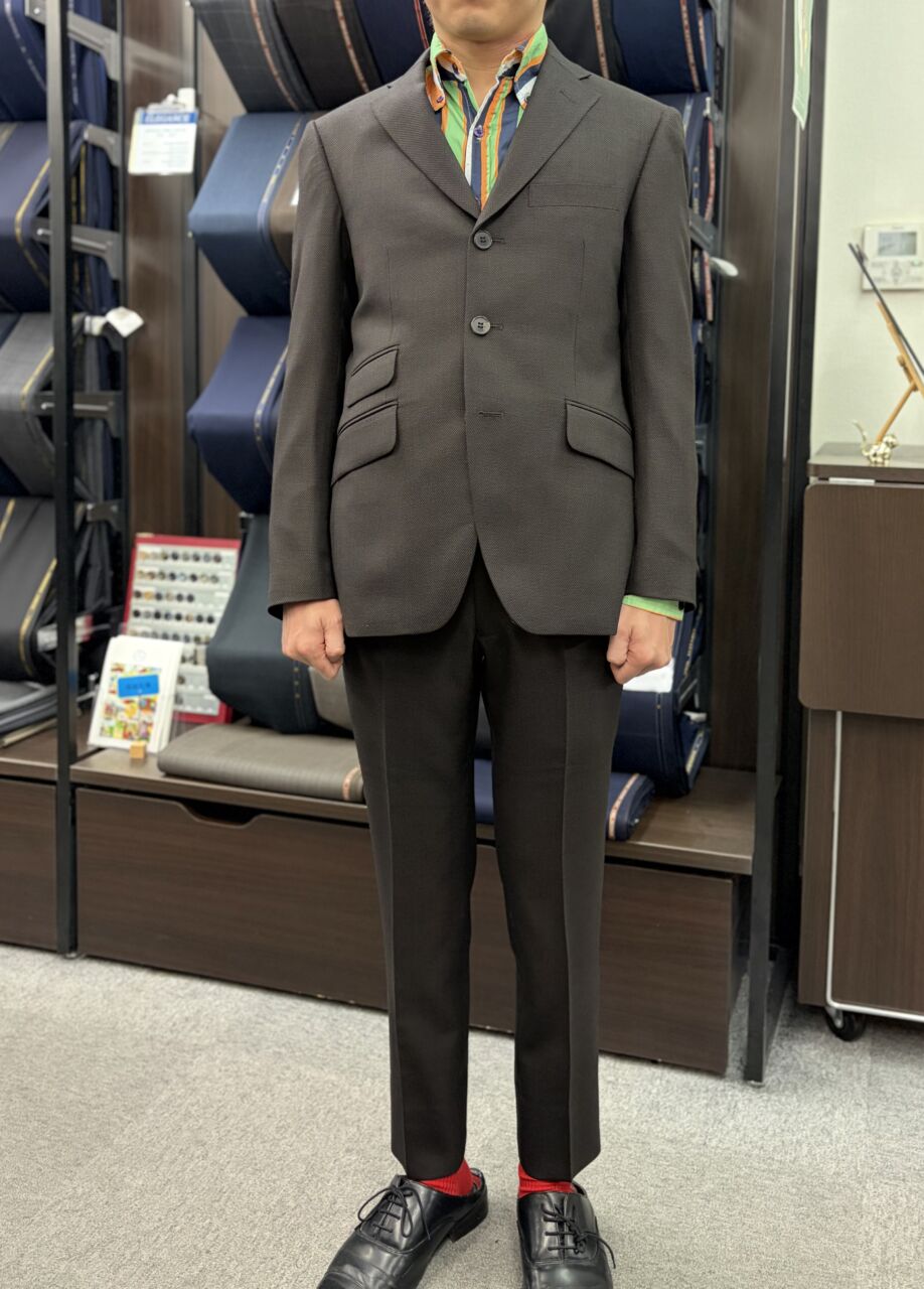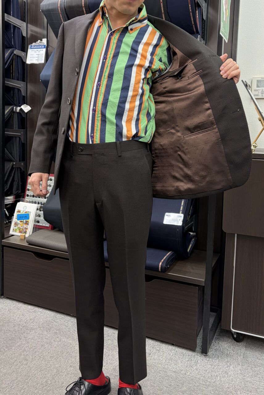 茶色×茶色×茶色 3釦スーツ オーダースーツSADA 赤羽店 投稿日 2026年3月1日 NEW! 最終更新日 2026年3月1日 3釦シングルスーツ 生地素材 フォルテ 7-5553 茶バーズアイ 裏地 柄裏84 茶色ドット ボタン SB123 本水牛薄茶 オプションその他 シック加工 担当スタイリスト