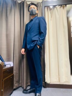 ストライプが映えるネイビースーツをこだわりのボタンと裏地でオシャレに決める