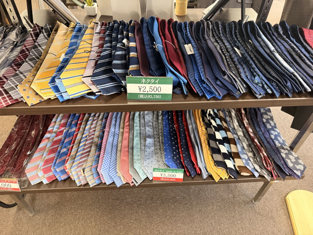 天神店ではスーツやシャツのほかにネクタイも取り扱っています。