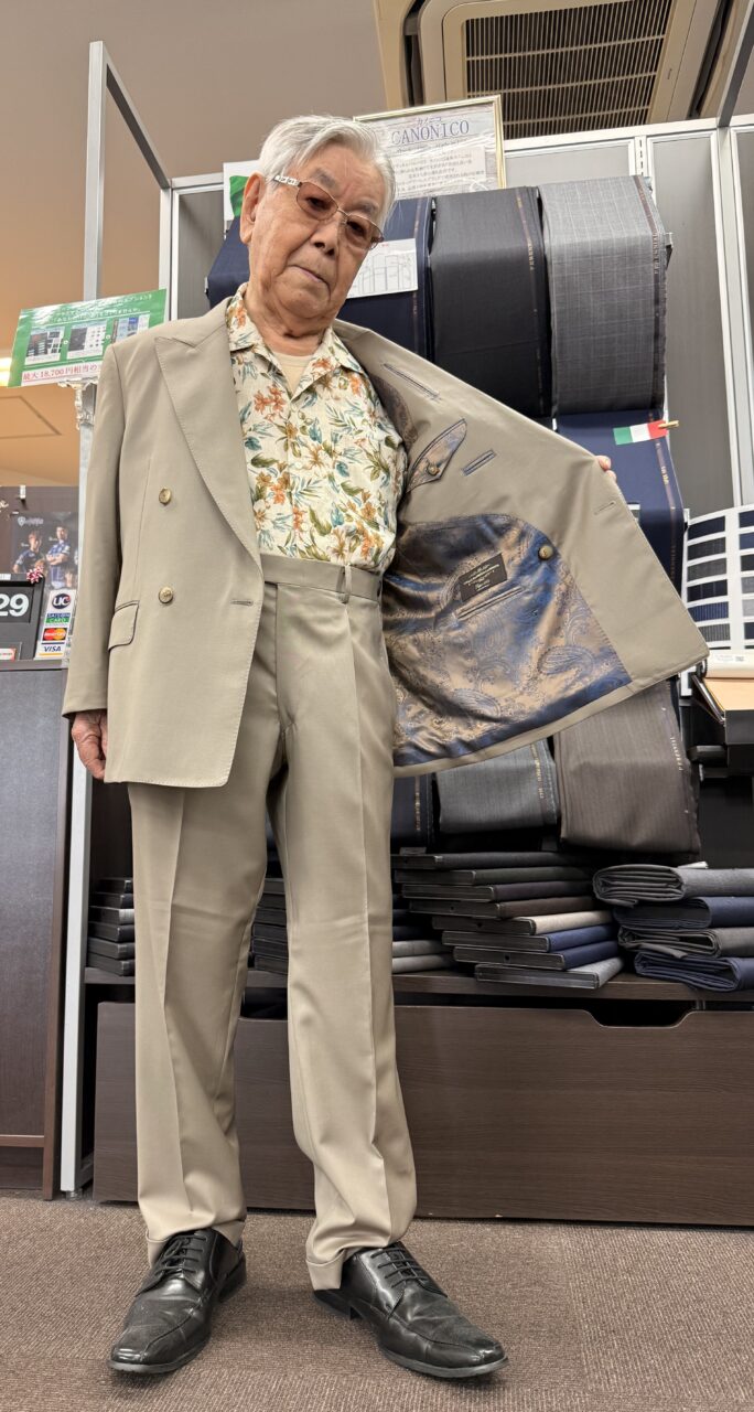 お好みのお色のベージュのダブルスーツでサイズはゆったりめでのご希望でした。