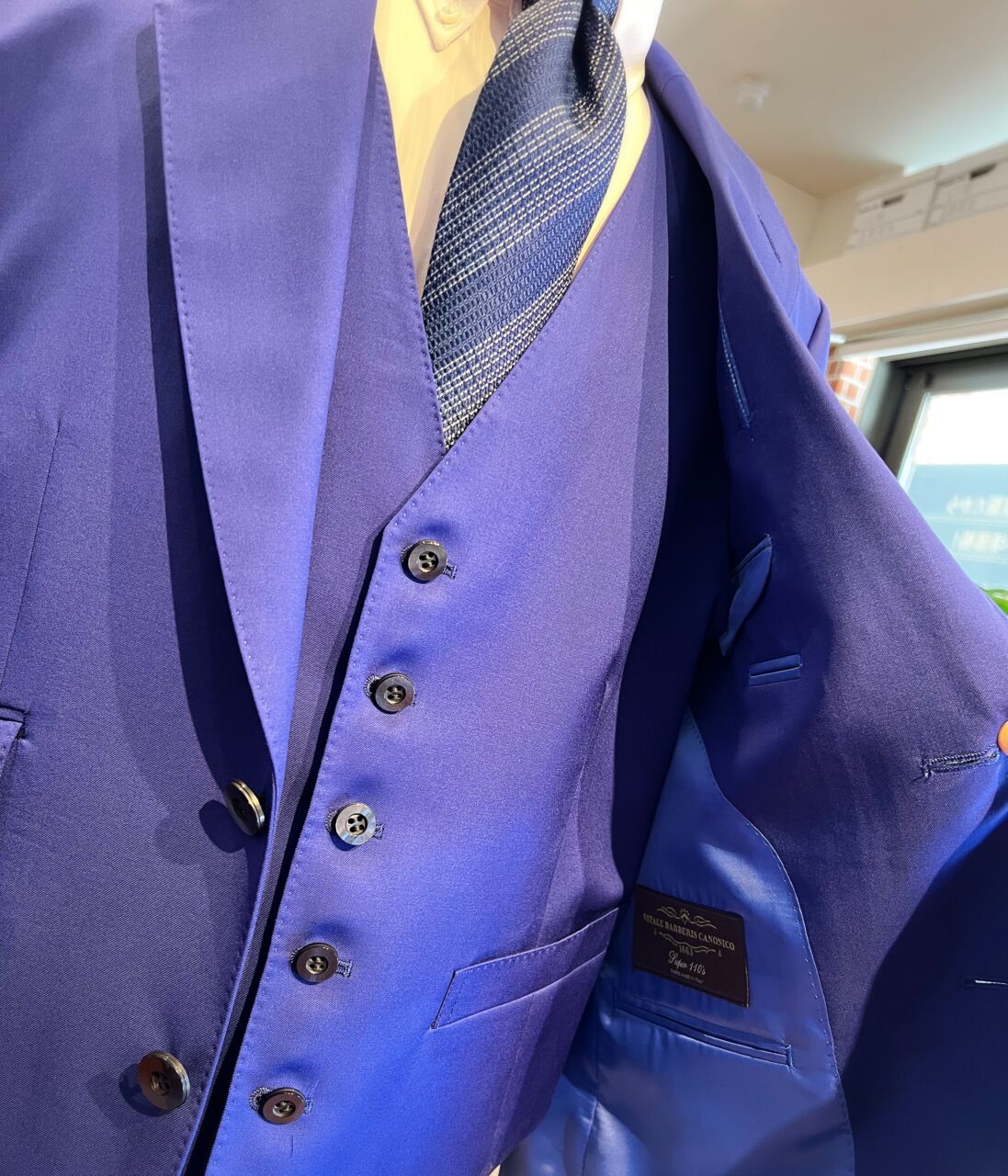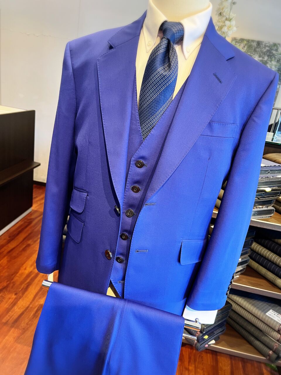 こちらのスーツはイタリア製、カノニコのエレガントシリーズからロイヤルブルーの生地でお仕立ていただきました。
