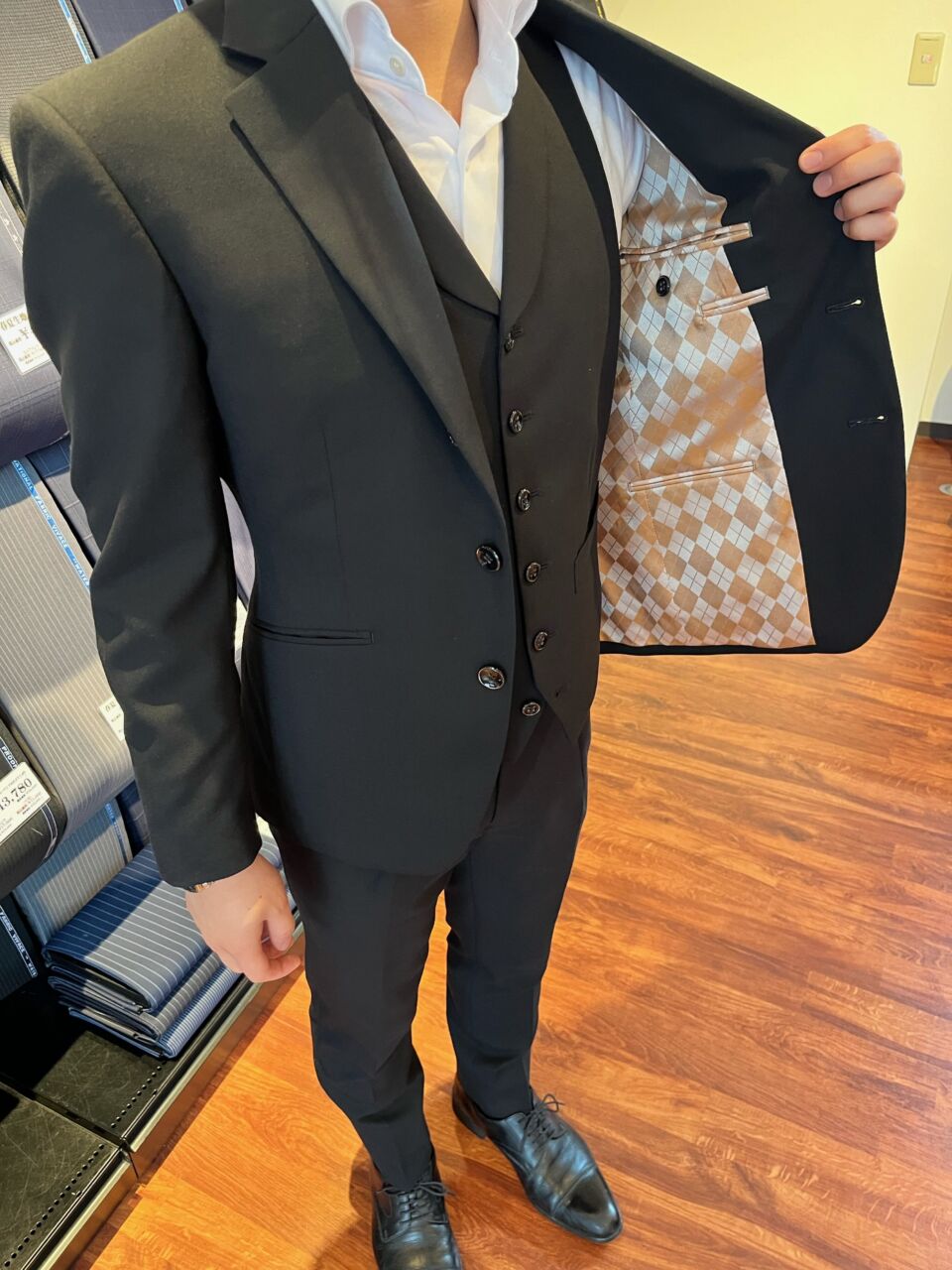 ビジネス用の無地ブラックで冠婚葬祭にも! M.M 様/20代/男性 オーダースーツSADA 福島郡山店 投稿日 2023年7月11日 最終更新日 2023年7月8日 この記事の内容は、2023年7月11日当時のものです。 公開から2年以上経過しています。(887日) 皆様こんにちは、SADA郡山店です! 本日はお客様の素敵なスーツをご紹介します。 スリーピース 生地素材 ウール100%+ストレッチ 無地ブラック 春夏生地 7-3541 裏地 SU714(キュプラ40%ポリエステル60%) アーガイル・オレンジ ボタン SB127(艶ブラック) オプションその他 PP加工 シック加工 重ね釦 担当スタイリスト 髙久