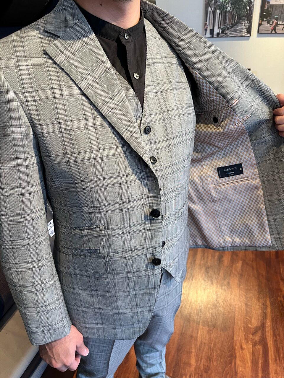 グレンチェックの柄が大人の余裕を醸し出す K.E様 オーダースーツSADA 福島郡山店 投稿日 2025年6月8日 最終更新日 2025年6月8日 3ボタン スリーピーススーツ 生地素材 ウール100% グレー グレンチェック 春夏生地 5-1528 72840 裏地 市松柄 ベージュ ボタン ナット ブラック オプションその他 スラントチェンジポケット 本切羽 シック加工 AMFステッチ 担当スタイリスト 髙久