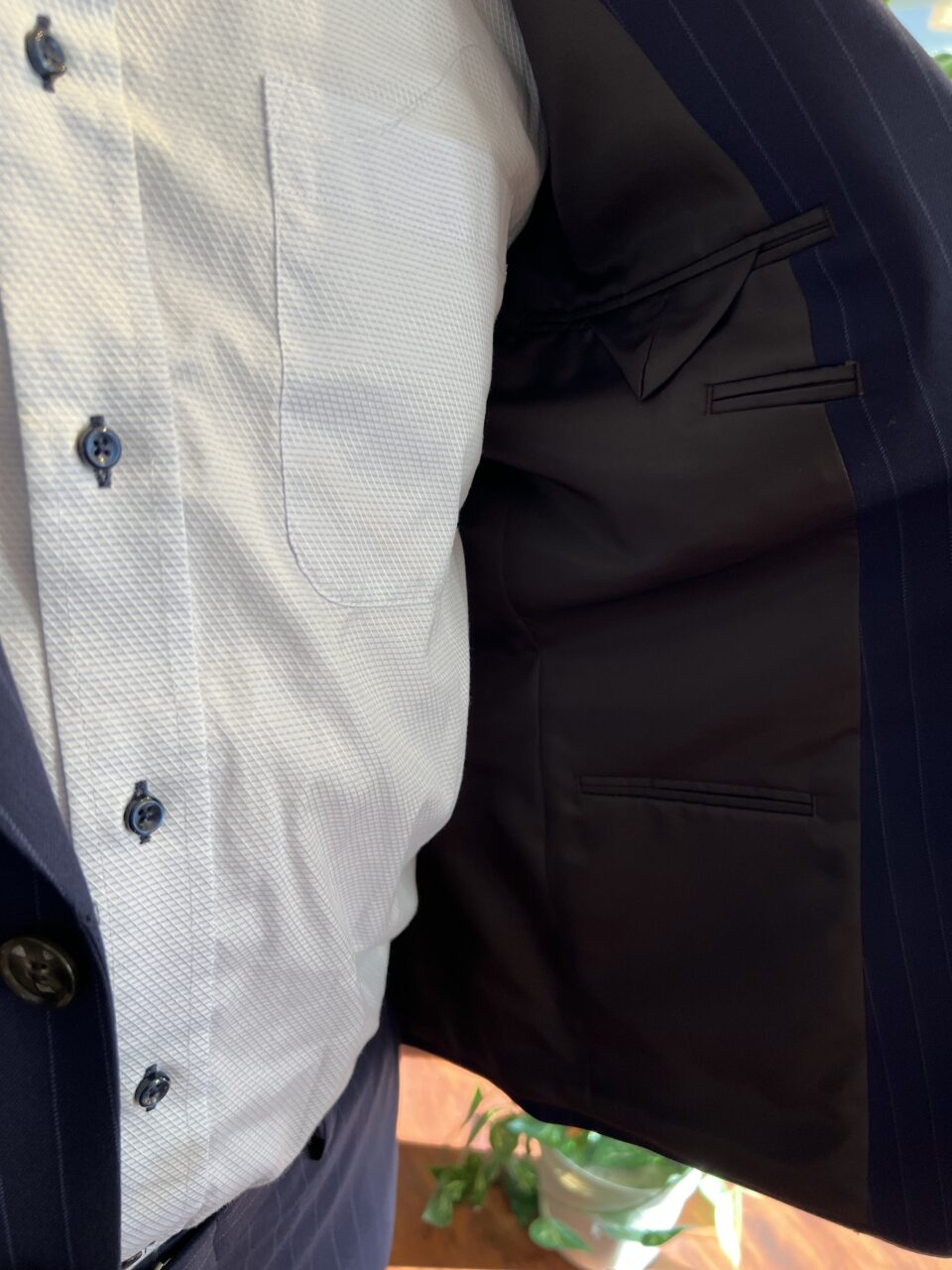セミノッチ衿でデザインにもこだわったスタイリッシュな1着 Y.Y様/男性 オーダースーツSADA 福島郡山店 投稿日 2025年10月31日 NEW! 最終更新日 2025年10月31日 2ボタン シングルスーツ 生地素材 ウール100% ネイビー ストライプ柄 秋冬生地 7-9549(フォルテ) 裏地 ポリエステル100% ダークブラウン 無地 ボタン M釦 ダークブラウン オプションその他 PP加工 シック加工 担当スタイリスト 栁田
