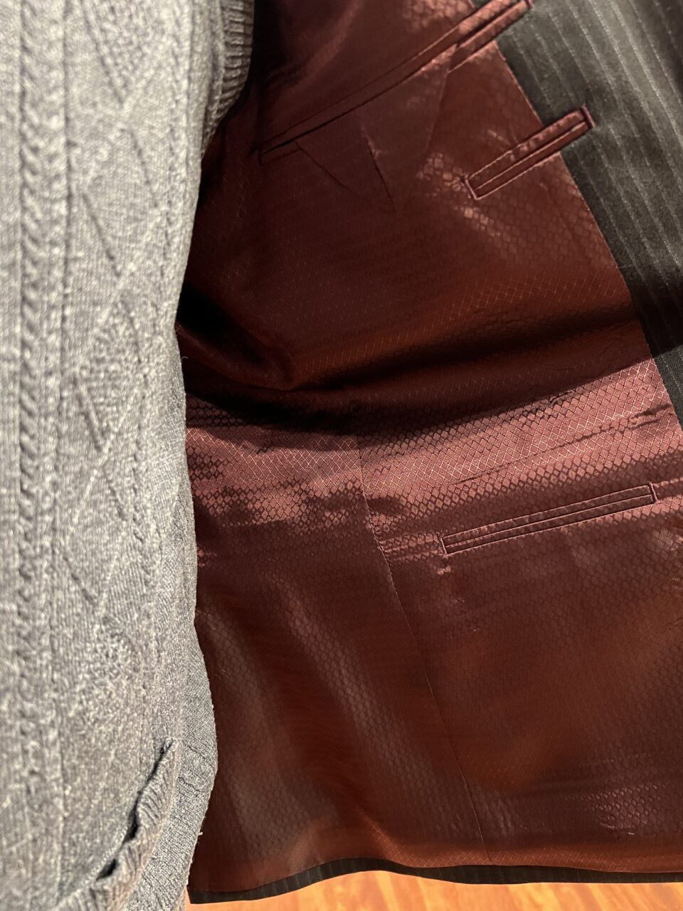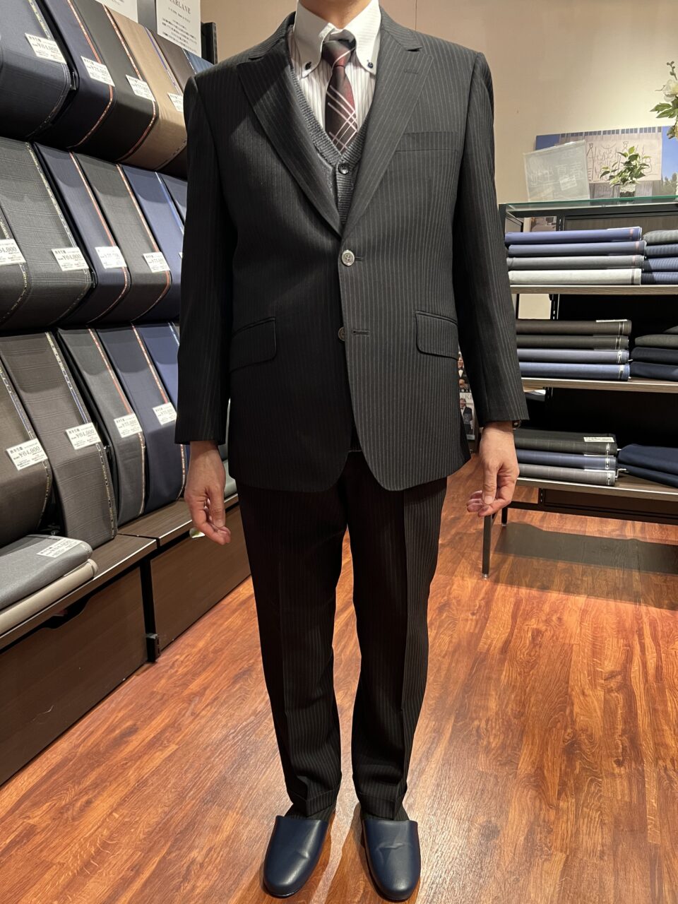 すっきりと見えるブラックストライプにちらりと見える裏地のボルドーカラーがお洒落な1着 S.T様 オーダースーツSADA 福島郡山店 投稿日 2025年11月29日 NEW! 最終更新日 2025年11月29日 2ボタン シングルスーツ 生地素材 ウール100% ブラック ストライプ柄 秋冬生地 6-3112(ビバーチェ) 裏地 キュプラ100% ボルドー ダイヤ格子柄(SU814) ボタン 貝釦(SB128) グレー オプションその他 AMFステッチ シック加工 PP加工 担当スタイリスト 栁田