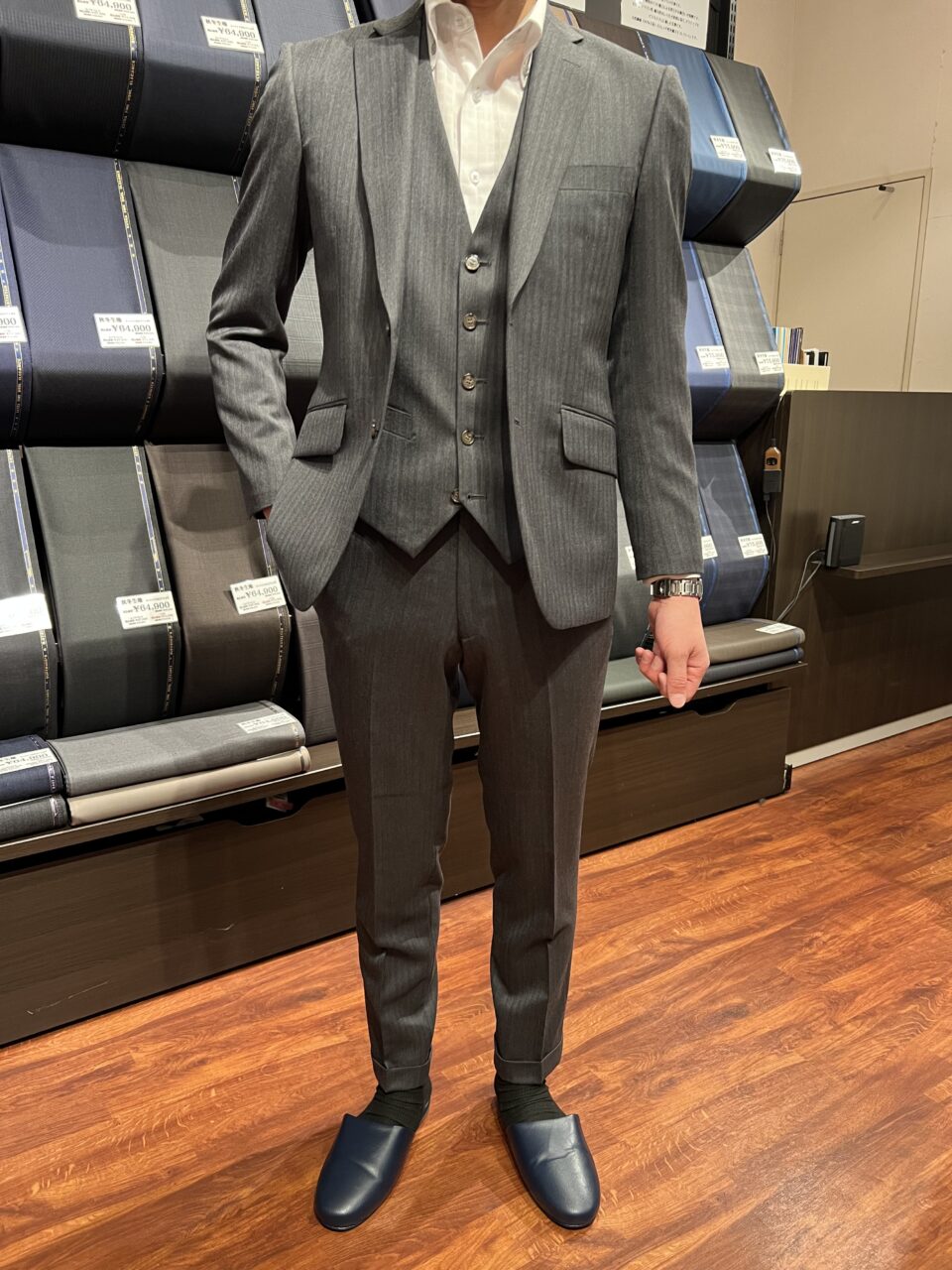 シャドーストライプが織り成すさりげない光沢が大人の上品さを醸し出す1着 N.I様 オーダースーツSADA 福島郡山店 投稿日 2025年11月30日 NEW! 最終更新日 2025年11月30日 スリーピース 生地素材 ウール100% グレー シャドーストライプ柄 秋冬生地 6-5112(ビバーチェ) 裏地 ポリエステル100% ベージュ 無地 ボタン M釦 ベージュ オプションその他 担当スタイリスト 片平