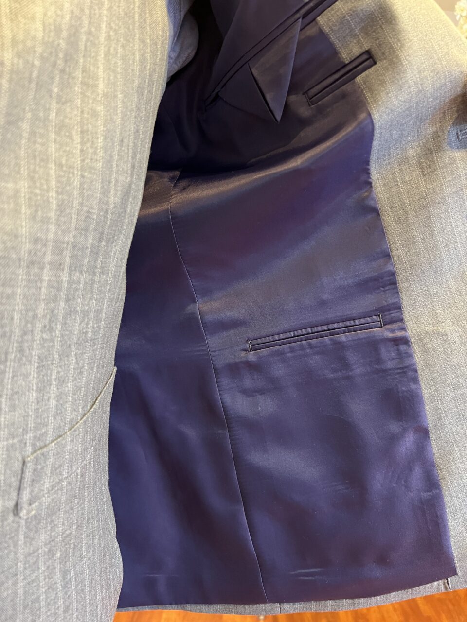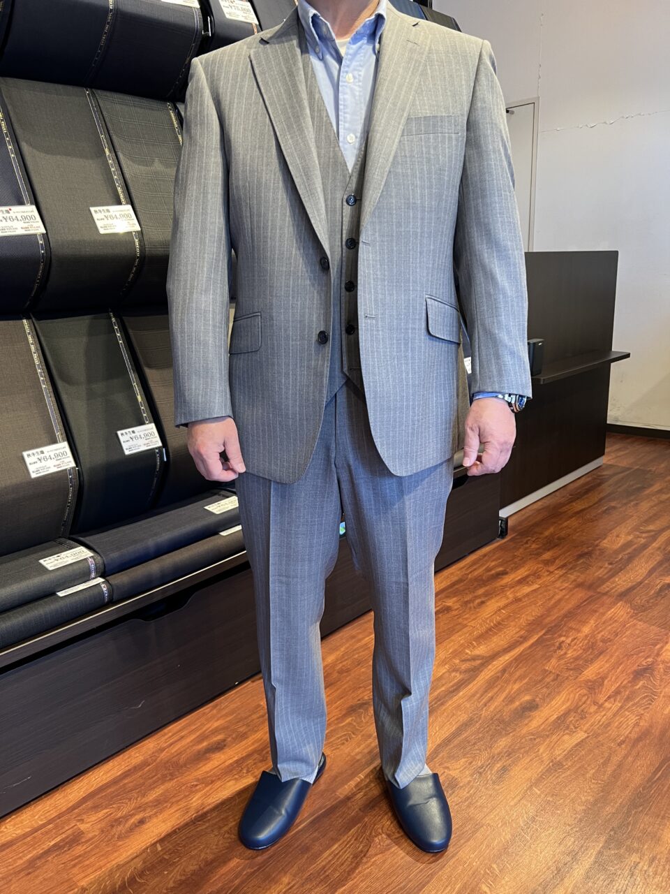 相性抜群のグレー×パープルでお洒落度を上げたオリジナルな1着 S.O様 オーダースーツSADA 福島郡山店 投稿日 2025年12月21日 NEW! 最終更新日 2025年12月21日 スリーピース 生地素材 ウール100% グレー ストライプ柄 秋冬生地 7-7553(フォルテ) 裏地 ポリエステル100% パープル 無地 ボタン M釦 ネイビー オプションその他 AMFステッチ 担当スタイリスト 片平