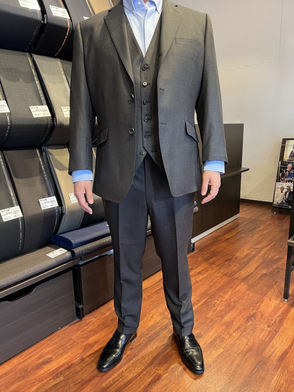 3釦段返り仕様のジャケットでメリハリのある体型にフィットしたスタイリッシュな1着 N.K様 オーダースーツSADA 福島郡山店 投稿日 2026年1月19日 NEW! 最終更新日 2026年1月19日 スリーピース 生地素材 ウール100% チャコールグレー チェック柄 秋冬生地 7-6857(ジョンフォスター) 裏地 キュプラ100% ブラウン ペイズリー柄(SU645) ボタン 本水牛釦(SB123) ダークブラウン オプションその他 HG高級仕立て PP加工 担当スタイリスト 栁田