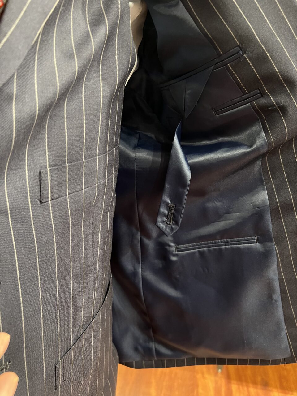 チョークストライプとメタル釦が相性の良いスタイリングで個性ある1着 A.I様 オーダースーツSADA 福島郡山店 投稿日 2026年2月7日 NEW! 最終更新日 2026年2月7日 Wスーツ6×2ボタン ベスト付き 生地素材 ウール100% ネイビー ストライプ 秋冬生地 7-0550 裏地 無地 ネイビー ボタン メタル釦 ゴールドいぶし オプションその他 担当スタイリスト 栁田