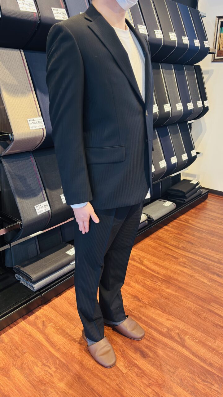 ブラックスーツにシャドウストライプ柄がさりげなくオシャレな1着 T.H様 オーダースーツSADA 福島郡山店 投稿日 2026年2月15日 NEW! 最終更新日 2026年2月15日 2ボタンシングルスーツ 生地素材 ウール70% ポリエステル30% ブラック ストライプ 7-5523 秋冬生地 裏地 グレー 無地 32 ボタン M釦 45 オプションその他 シック加工 担当スタイリスト 栁田