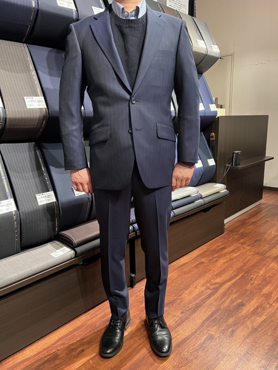 ストライプ柄の縦線効果がより引き締まって見えるスッキリ仕上がった1着 M.H様 オーダースーツSADA 福島郡山店 投稿日 2026年2月17日 NEW! 最終更新日 2026年2月17日 2ボタン シングルスーツ 生地素材 ウール100% ネイビー ストライプ柄 秋冬生地 7-5837(エレガンス) 裏地 ポリエステル100% 無地(32) グレー ボタン C釦 ネイビー オプションその他 PP加工 担当スタイリスト 片平