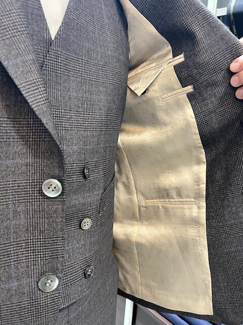 SADAでは今シーズン、紺色やグレーなどご用意しておりますが、今回はSADAのオリジナルウール生地のブラウン地のチェックでお仕立ていただきました!