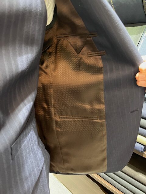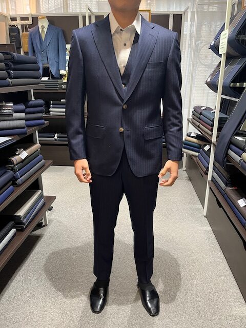 お選びいただいたのはSADAのスタンダードウール生地FORTEより紺ストライプ。