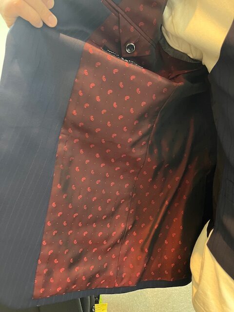 裏地は紺色と相性抜群の深い赤色のペイズリー柄。