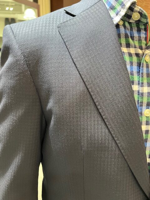 お選びいただいたのはSuper100’s、ドレープ感溢れる紺色折柄生地です。
