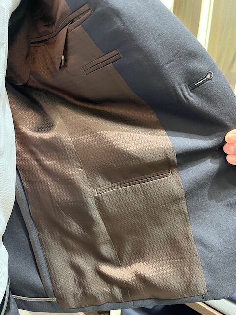 お選びいただいた裏地はキュプラ素材のブラウン×ドビー柄。