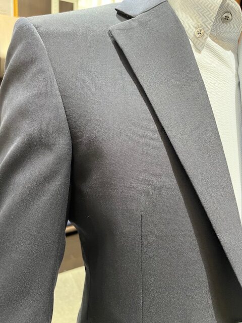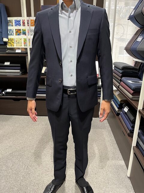 通年Super100’s紺無地×OPセット(ドビー裏地/水牛釦/T仕立て)=間違いない1着です。
