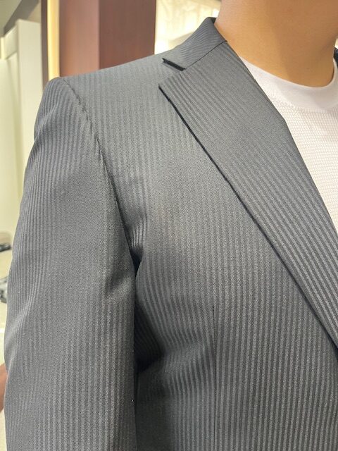 近くで見るとシャドーストライプがスーツに立体感を与えてくれ、仕上がりがきれいでよりビジネスライクなシーンにうってつけですね✨