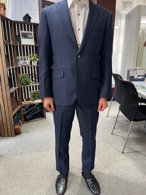 お仕立ていただいたのはスタンダードウール生地FORTEより紺色×チェック柄の2ピーススーツ。