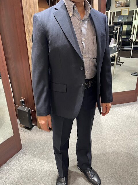 お選びいただいた生地は国産メーカー「国島毛織」BEST SELECTIONより濃紺ヘリンボーン柄。