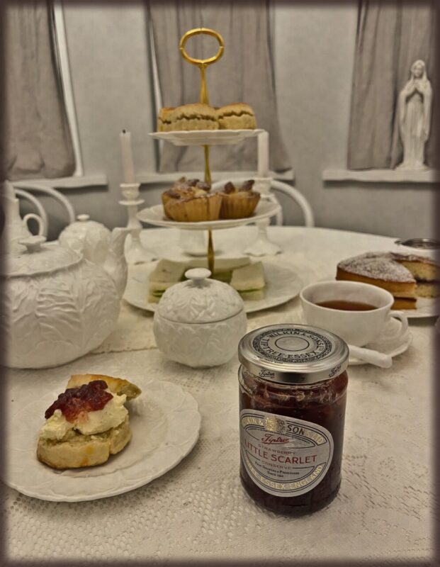 英國名作図鑑63 ティップトリー オーダースーツSADA 金沢香林坊店 投稿日 2025年9月1日 最終更新日 2025年9月2日 ★ 『ティップトリー』は イギリスのジャム・ブランド。 ウィルキンファミリーは 1757年からイギリス・エセックス州ティプトリーで農業を営み、 1885年からはここで『ウィルキン&サンズ』として 高品質の保存食を製造。 伝統的な英国産フルーツを幅広く栽培し、 農場に併設されたナッツフリーの工場で コンセルジュや調味料を製造しています。 130年以上も受け継がれる伝統のレシピに基づき、 広大な自家農園と信頼できる農園で。 収穫された果実を原料とし、 合成着色料や香料、保存料は一切使用していません。 ★★ 『ウィルキン&サンズ』のジャムブランド『ティップトリー』は フルーツを手作業で検査し、 伝統的な銅底の鍋を使って少量ずつ調理しています。 1911年、英国王ジョージ5世からロイヤルワラント授与。 2010年にはエリザベス女王が工場を訪問。 ★★ 創業者ウィルキンが100年以上前に アメリカを訪れた時に見つけた北米産の 野生ストロベリー、リトルスカーレットという品種は 素晴らしいジャムになると見抜いてイギリスに持ち帰った。 その名の通り真っ赤で極小の 香り豊かな希少なストロベリーで、 完熟したストロベリーを手で摘み取り 形を残したまま何時間も銅鍋で煮詰めます。 ジャムにするにはたくさんの量を手摘みで行われなければならず、 人も時間も労力もいる。 しかも収穫の時期は通常のストロベリーに比べて短く3週間で それを過ぎると熟しすぎてしまい、 たくさんは収穫できない。 元々北米原産で、現在では英国のティプトリー村だけで栽培。 世界中でも唯一『ウィルキン&サンズ』が商業的に栽培している。 イアン・フレミングの小説『ロシアより愛をこめて』では ジェームズ・ボンドお気に入りのコンサーブとして 『フランク・クーパー』オックスフォードマーマレードと 『ティップトリー』リトル・スカーレットが登場する。 主に『アフタヌーンティー』のスコーンの 『ロダス』クロテッドクリームと合わせてたっぷり使用。 ★★ スイートチップラズベリーは ラズベリーの甘みと程よい酸味を利用して作られ、 ラズベリーシードのプチプチとした食感が特長。 主に『ヴィクトリアサンドイッチケーキ』でたっぷり使用。 ★ ★ ロイドセルフレームスペクタクルズ : 『ポールスミス 』 ボーダーシルクニットタイ :『ポールスミス 』 シルクパイピングジャケット:『ポールスミス』 ハイバックトラウザーズ :『ポールスミス』 サドルシューズ:『ポールスミス 』 フープピアス : 『リンクス』 ★ コンサバトリーでの アフタヌーンティーに欠かせない スリーティアケーキスタンドには 一段目『サーソンズ』漬けキューカンバーサンドイッチ 二段目フェアリーケーキ 三段目ロンドンスコーン。 スコーンには『ティップトリー』リトルスカーレット・ジャムと 『ロダス』クロテッドクリーム。 『フォートナム&メイソン』ロイヤルブレンドティー とA2コールドホールミルク そして『ティップトリー』スイートチップラズベリージャムを たっぷり挟んだ『ヴィクトリア・サンドイッチ・ケーキ』。 更にロンドンスコーンをナイフで半分に割って 先にクロテッドクリームをクラストごと盛ってから 『ティップトリー』リトルスカーレットジャムを盛って楽しみます。 ★ 注:これらの作品は重田将秀店長の所有物であり オーダースーツSADAでは販売しておりません。 ★
