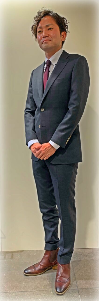 590 裾口4.5!ミルクティーブラウン釦に拘ったグレースーツ