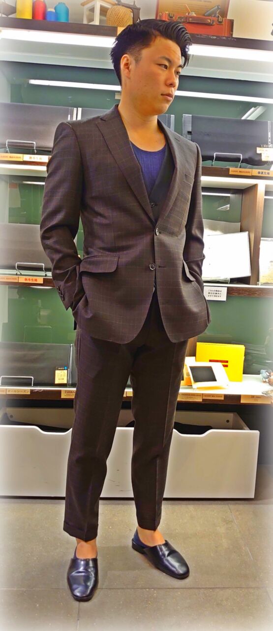 エンジのウインドウペンが特徴のブラウングレンチェック生地で、