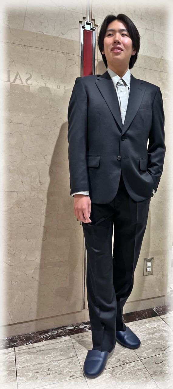 2362 王道のブラックスーツ T.A様 20代 男性 オーダースーツSADA 金沢香林坊店 投稿日 2025年12月31日 NEW! 最終更新日 2024年11月5日 購入日2024年10月6日 シングルブレステッド2ツ釦 生地素材 シーズン 3シーズン 生地の色ブラック 生地の柄ピュア 生地番号8‐2191 裏地 ミッドナイトブルー ボタン ブラックマットナット オプションその他 クラシックな8.5レギュラーゴージノッチドラペル 当然サイドヴェンツ 流行の2フォワードディーププリーツトラウザーズ 当然サイドシームポケット 担当スタイリスト 重田
