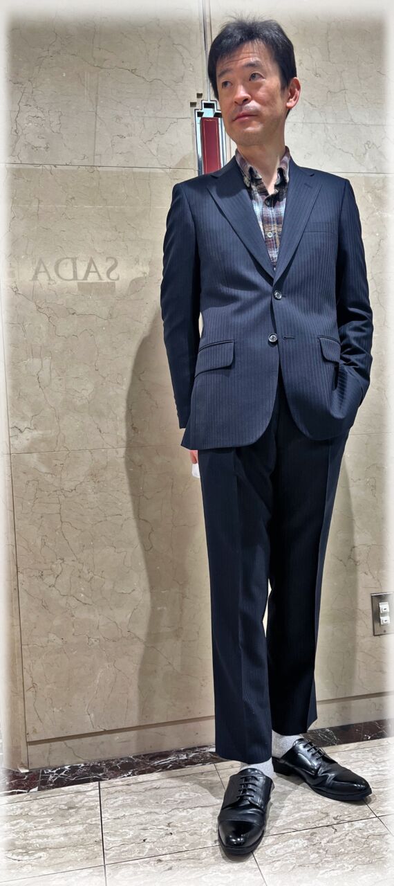 2401 王道のダークネイビーシャドウストライプ T.H様 50代 男性 オーダースーツSADA 金沢香林坊店 投稿日 2026年2月5日 NEW! 最終更新日 2024年12月9日 購入日2024年11月4日 シングルブレステッド2ツ釦 生地素材 シーズン秋冬 生地の色ダークネイビー 生地の柄シャドウストライプ 生地番号7-9506 裏地 チョコレートブラウン ボタン チョコレートブラウンマット オプションその他 クラシックな8.5レギュラーゴージノッチドラペル 当然サイドヴェンツ 流行の2フォワードディーププリーツトラウザーズ 当然サイドシームポケット 担当スタイリスト 重田 将秀