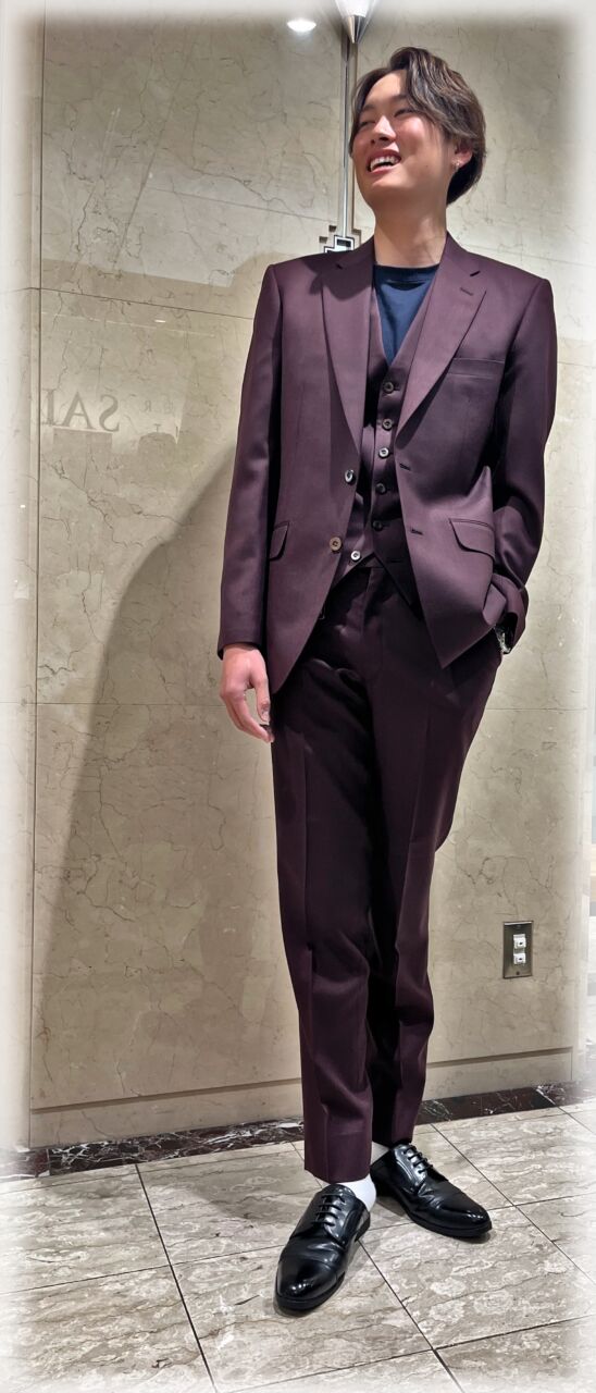 2403 モダンなボルドースーツ A.Y様 20代 男性 オーダースーツSADA 金沢香林坊店 投稿日 2026年2月7日 NEW! 最終更新日 2024年12月9日 購入日2024年11月4日 シングルブレステッド2ツ釦3ツ揃 生地素材 シーズン秋冬 生地の色ボルドー 生地の柄ピュア 生地番号7-5576 裏地 パープルペイズリー ボタン ブラウングリッター オプションその他 クラシックな8.5レギュラーゴージノッチドラペル スタイリッシュなスランテッドポケット 担当スタイリスト 重田 将秀