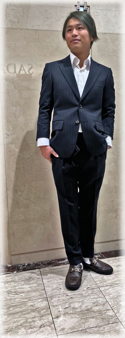 2435 ラグジュアリー感あるオルタネイトストライプ R.M様 20代 男性 オーダースーツSADA 金沢香林坊店 投稿日 2026年3月10日 NEW! 最終更新日 2024年12月23日 購入日2024年12月2日 シングルブレステッド2ツ釦 生地素材 シーズン秋冬 生地の色ネイビー 生地の柄オルタネイトストライプ 生地番号7‐9524 裏地 チョコレートブラウン ボタン チョコレートブラウンマット オプションその他 クラシックな7.5レギュラーゴージノッチドラペル 当然サイドヴェンツ 流行の2フォワードディーププリーツトラウザーズ 当然サイドシームポケット ピスポケットレス 担当スタイリスト 重田将秀
