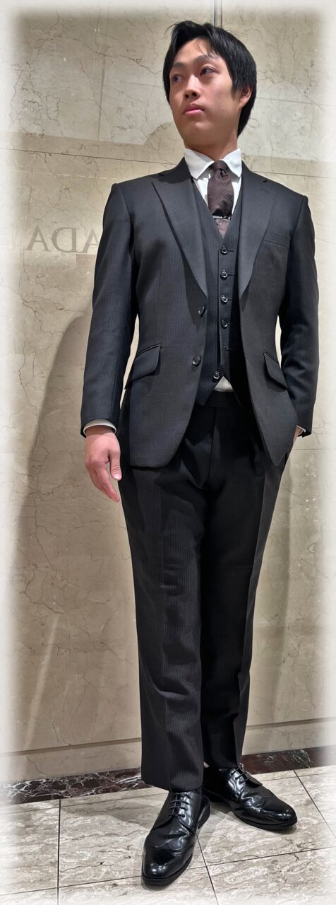 2439 モダンなブラウンスーツ R.K様 20代 男性 オーダースーツSADA 金沢香林坊店 投稿日 2026年3月14日 NEW! 最終更新日 2024年12月27日 購入日2024年11月12日 シングルブレステッド2ツ釦3ツ揃え 生地素材 シーズン秋冬 生地の色ブラウン 生地の柄ブラックストライプ 生地番号7-5527 裏地 シャンパンゴールドペイズリーベンベルク ボタン チョコレートブラウンマット オプションその他 クラシックな8.5レギュラーゴージノッチドラペル 当然サイドヴェンツ スタイリッシュなスランテッドポケット 流行の2フォワードディーププリーツトラウザーズ 当然サイドシームポケット ピスポケットレス 担当スタイリスト 重田 将秀