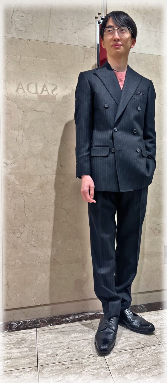 2450 クラシックなチョークストライプ T.M様 20代 男性 オーダースーツSADA 金沢香林坊店 投稿日 2026年3月23日 NEW! 最終更新日 2024年12月31日 購入日2024年11月24日 ダブルブレステッド6ツ釦 生地素材 シーズン秋冬 生地の色チャコールグレー 生地の柄チョークストライプ 生地番号29415-23 裏地 パープルペイズリーベンベルグ ボタン チョコレートブラウンホーン オプションその他 美しすぎる9.5ハイゴージピークドラペル 当然サイドヴェンツ オーダー感あるピックステッチ サージョンズカフス パープルペイズリーベンベルグチーフ仕立て 流行の2フォワードディーププリーツトラウザーズリバース 当然サイドシームポケット ピスポケットレス 5.0ウェストバンド 担当スタイリスト 重田将秀
