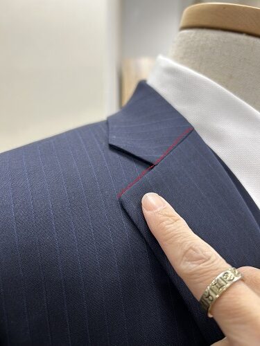 ノッチドラペルよりも約5から7ミリ下の襟先が上がっているのが線を観て分かると思います。