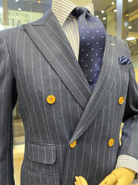 ベーシックなストライプのスーツは何着も持っている、もう少し個性を出せるストライプスーツが欲しいという方には是非挑戦していただきたい柄です。