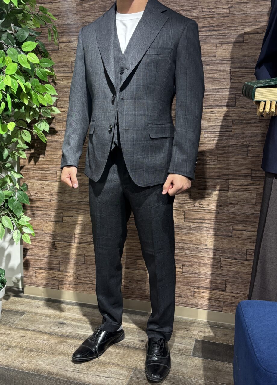 オーダーならではのサイズ感で仕立てたチェックスーツ D.K様 オーダースーツSADA 丸井錦糸町店 投稿日 2025年12月15日 NEW! 最終更新日 2025年12月15日 3つボタン段返り3ピーススーツ 生地素材 秋冬生地 59433-57 BESTSELECTION チャコールグレーグレンチェック 裏地 無地 ワインレッド ボタン 水牛釦 黒 オプションその他 クラシックでフォーマルな3ピース 強く絞ってスタイリッシュなウエストライン 担当スタイリスト 大川