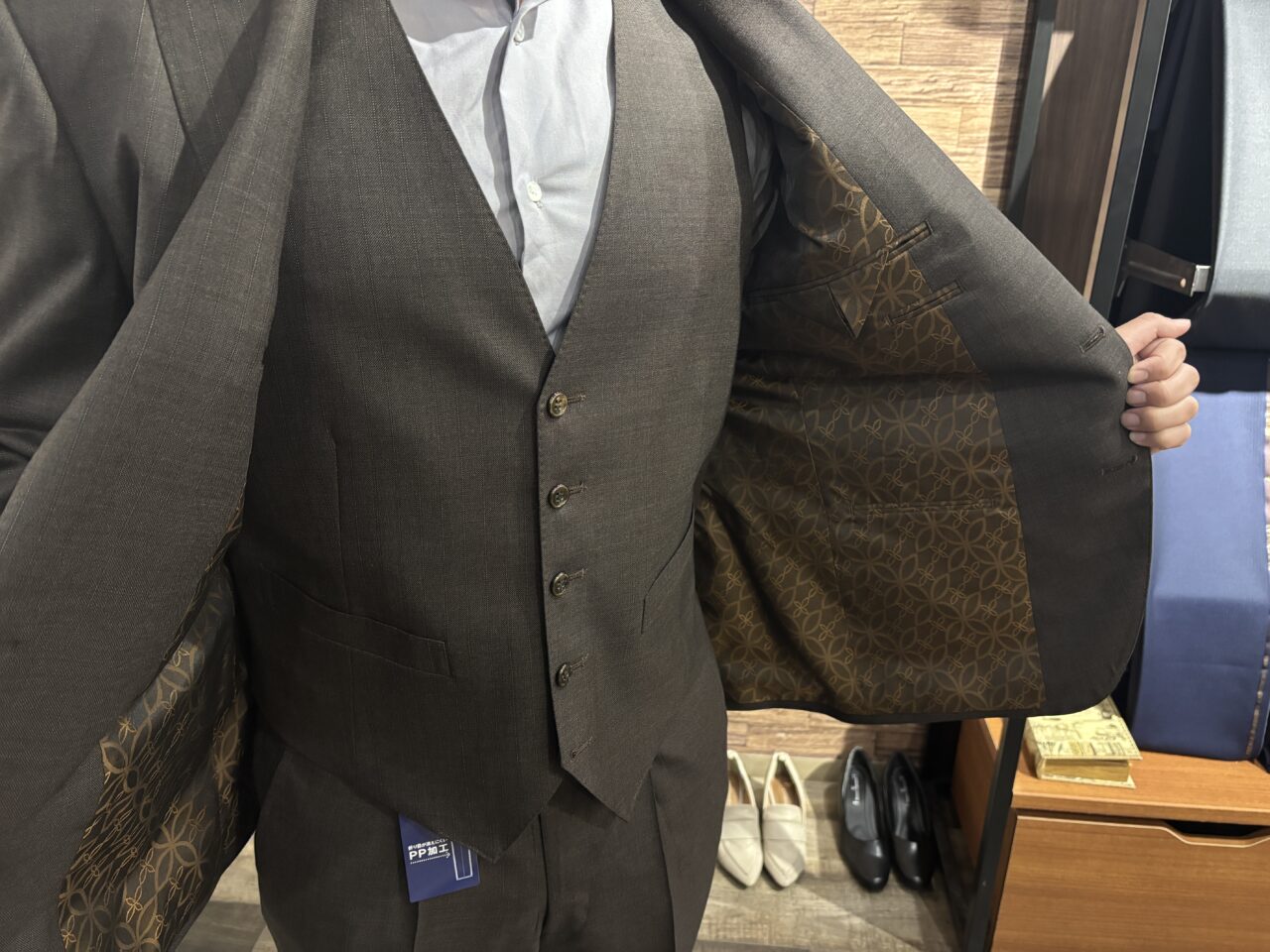 トレンドのブラウンスーツ T.S様 オーダースーツSADA 丸井錦糸町店 投稿日 2025年12月18日 最終更新日 2025年12月18日 2つ釦スリーピース 生地素材 ELEGANCE 7-6840 ブラウンシャドーストライプ 裏地 キュプラ混紡裏地 No.706 ボタン サンダー 茶 No.125 オプションその他 鍛えた体にもジャストフィットするオーダースーツ AMFステッチ パンツ裾口W4.0cm PP加工 担当スタイリスト 大川